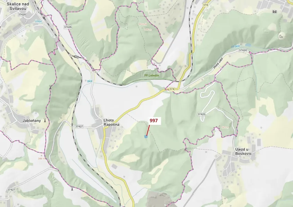 Lesní pozemek o výměře 1938 m2, parcelní číslo 997, podíl 1/1, katastrální území Lhota Rapotina, obec Lhota Rapotina, obec s rozšířenou působností Boskovice, okres Blansko, Jihomoravský kraj. Po těžbě.