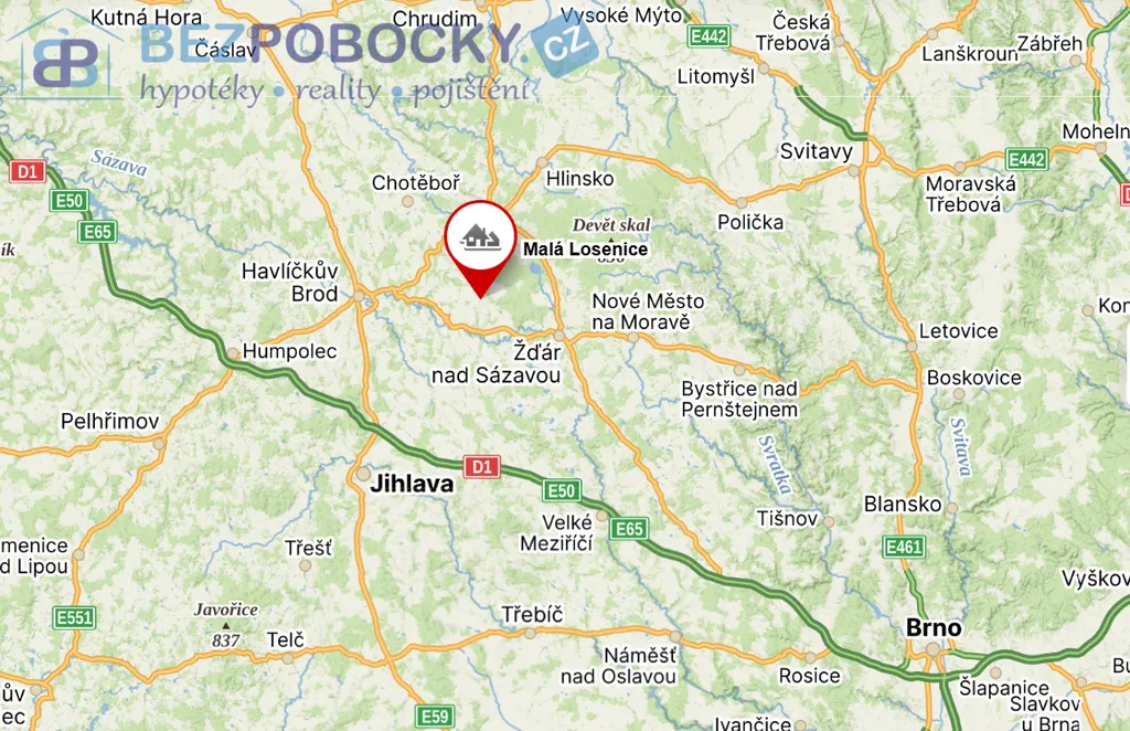 Pozemky jsou v klidné lokalitě na mírném jižním svahu s dobrou dostupností do města Žďár nad Sázavou, Přibyslavi.