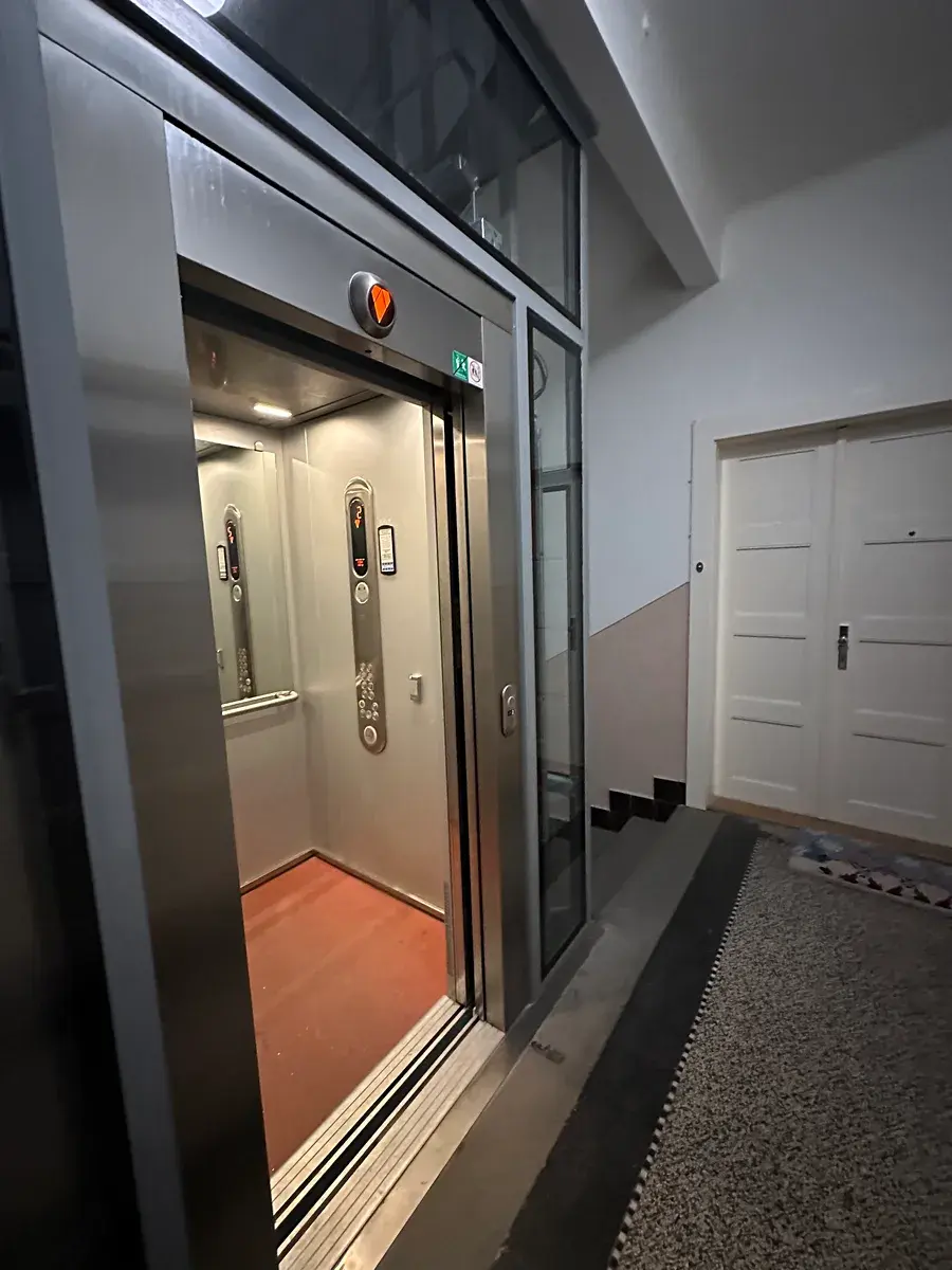 Do 3. nadzemního podlaží činžovního domu se dostaneme novým prostorným výtahem.