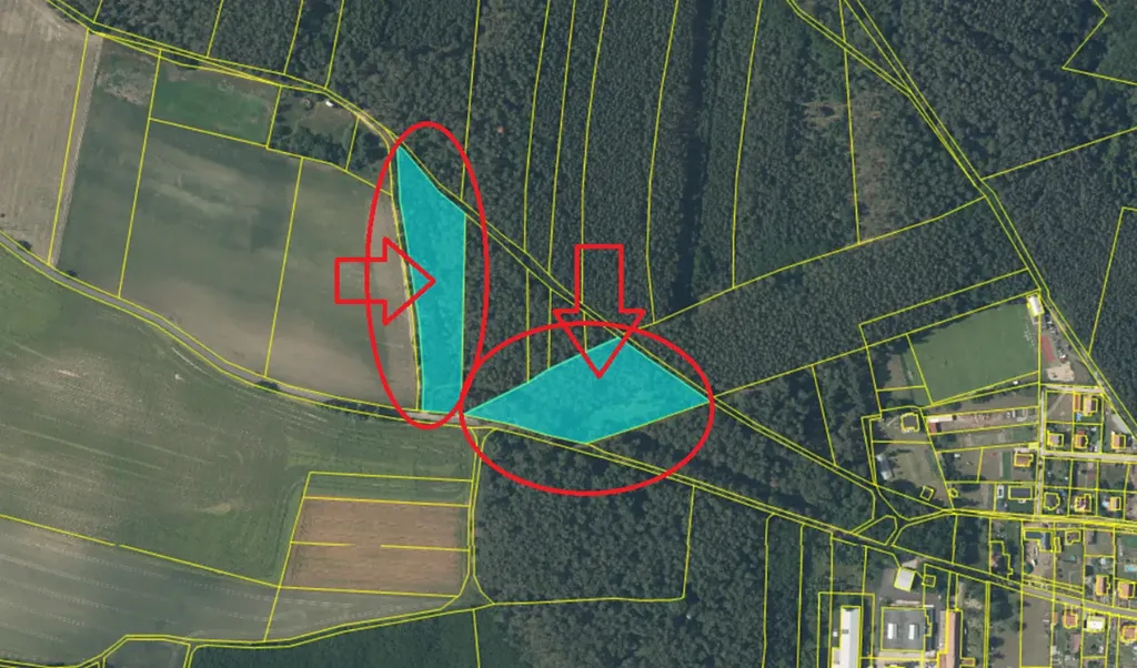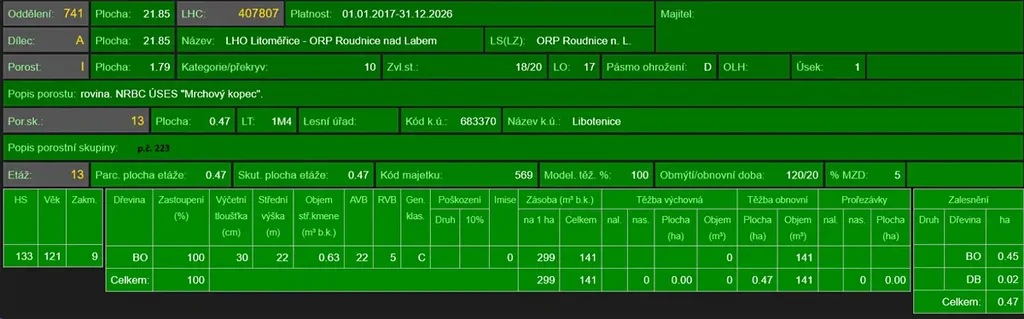 - p.č. 223 vedená jako lesní pozemek o celkové výměře 9 476 m2 (stáří lesa 130 let - zastoupení dřevin borovice),