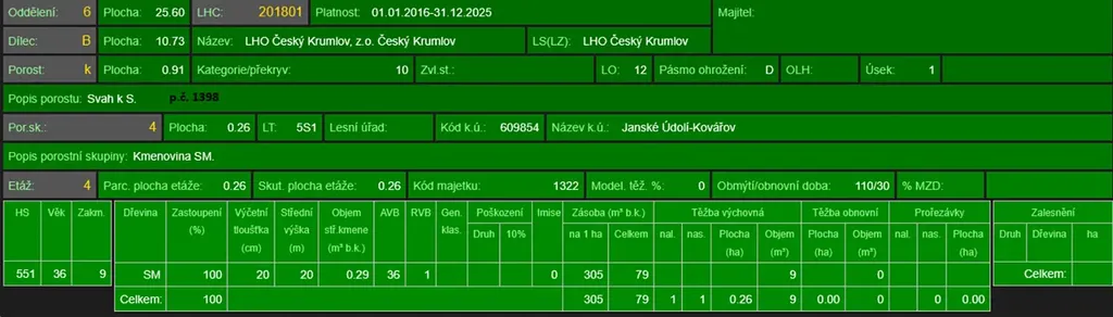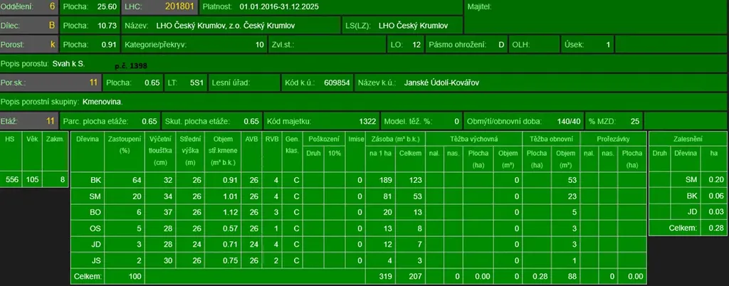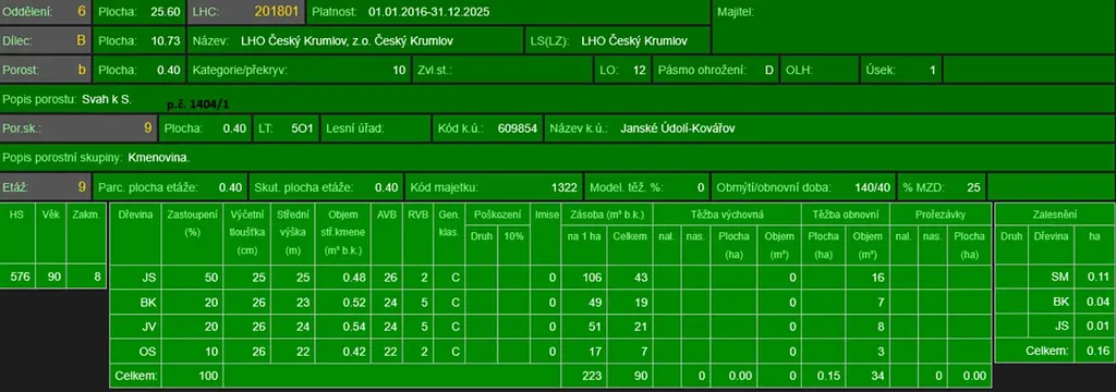 - p.č. 1398 vedená jako lesní pozemek o celkové výměře 9 096 m2, z toho vlastníme 5/12 tedy 3 790 m2 (stáří lesa 115 let - zastoupení dřevin buk, smrk, borovice, topol, jedle, jasan, stáří lesa 46 let - zastoupení dřevin smrk),