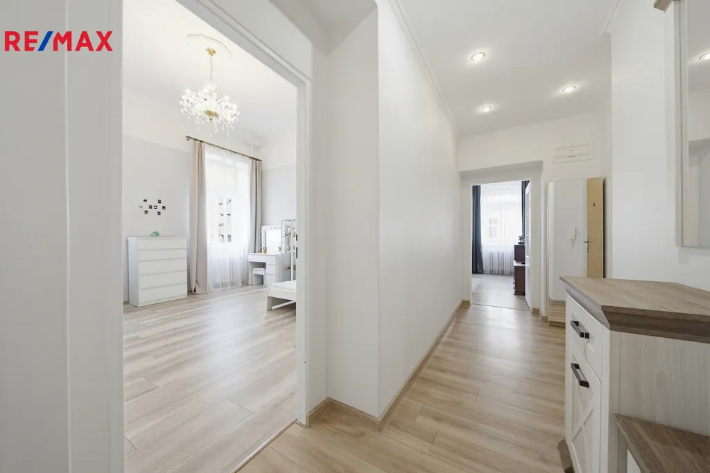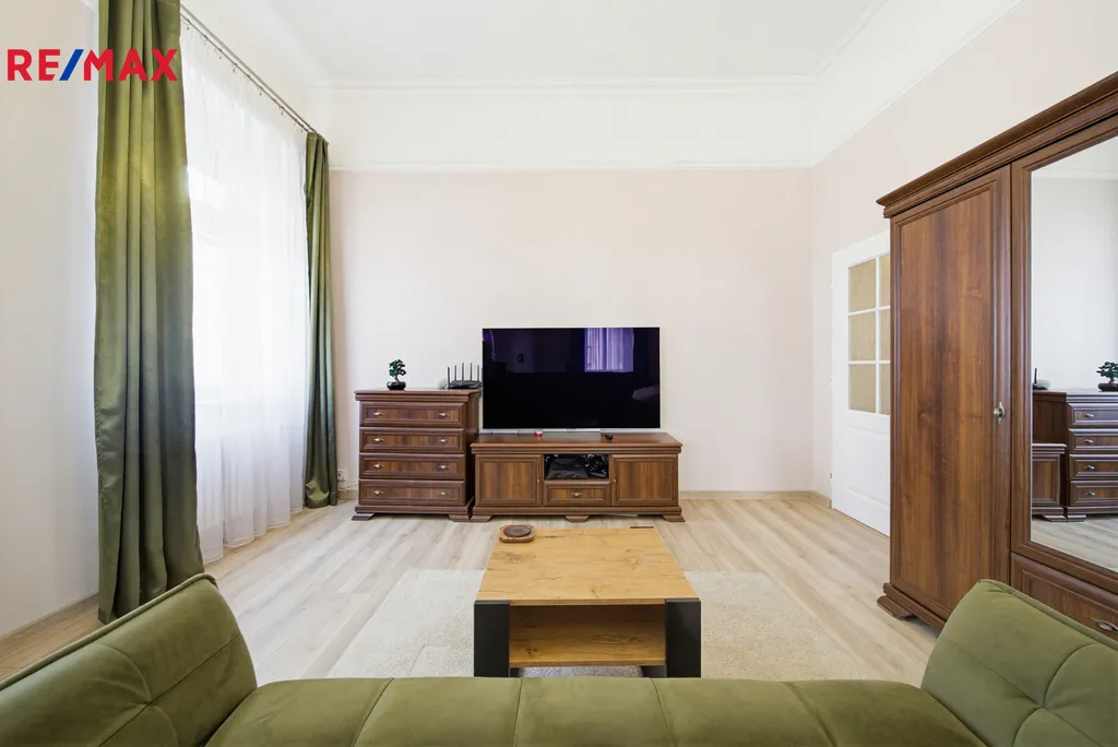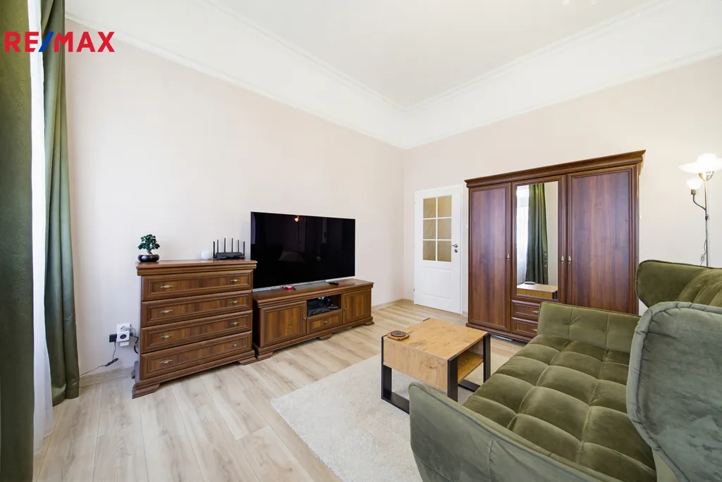 Byt je zařízen stylovým nábytkem, který harmonicky ladí s prostornými místnostmi a vysokými stropy o výšce 3,6 m. Jedna z velkých místností je díky promyšlenému zónování rozdělena na ložnici a obývací část, přičemž zde zůstává i prostor vhodný pro pracovní kout nebo domácí kancelář.