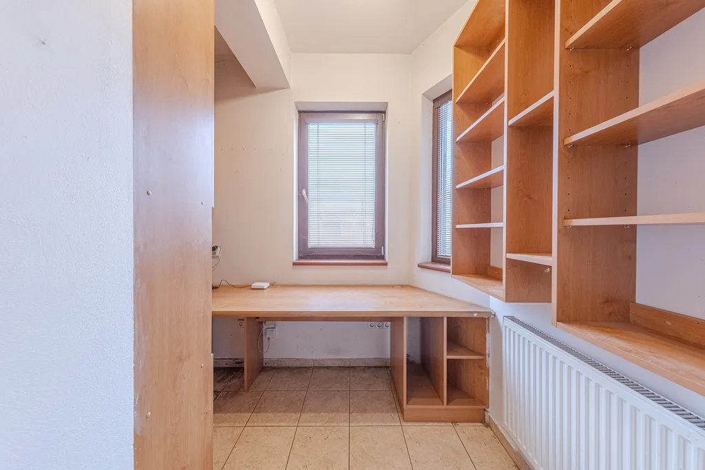 Součástí přízemí je také prostorná místnost o velikosti 14 m² s výhledem do dvora, která přímo navazuje na stájové prostory a umožňuje pohodlný průchod z domu do stájí.