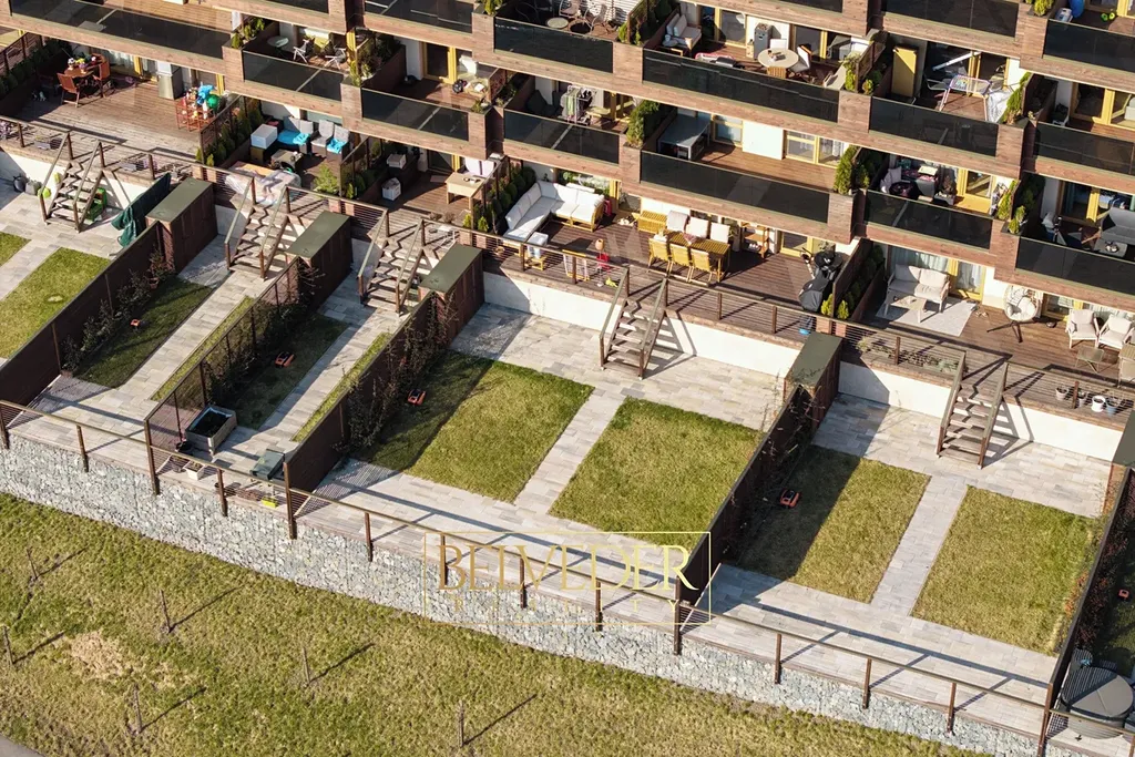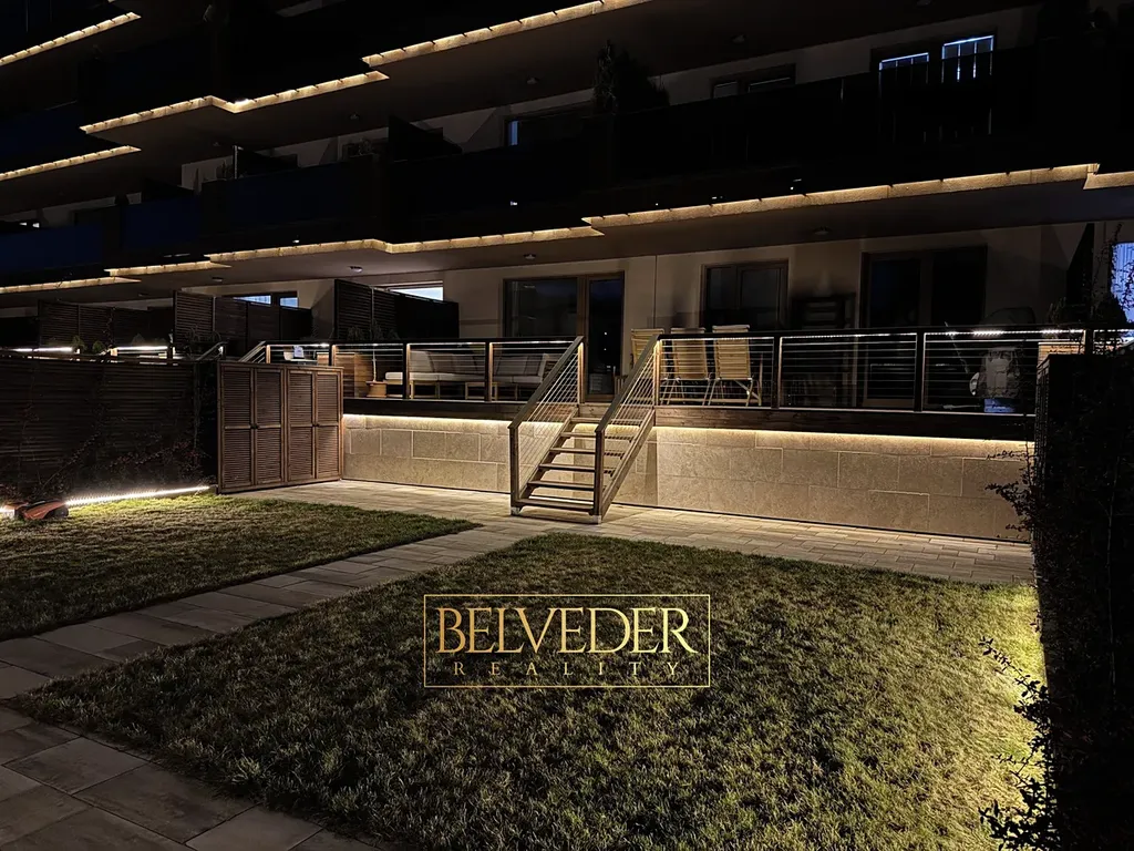 Zahrada je vybavena automatickým zavlažováním a robotickou sekačkou, které se postarají o její perfektní stav, zatímco vy můžete trávit čas odpočinkem na terase. Večerní osvětlení pak proměňuje zahradu v elegantní a klidné místo pro relax i letní posezení.