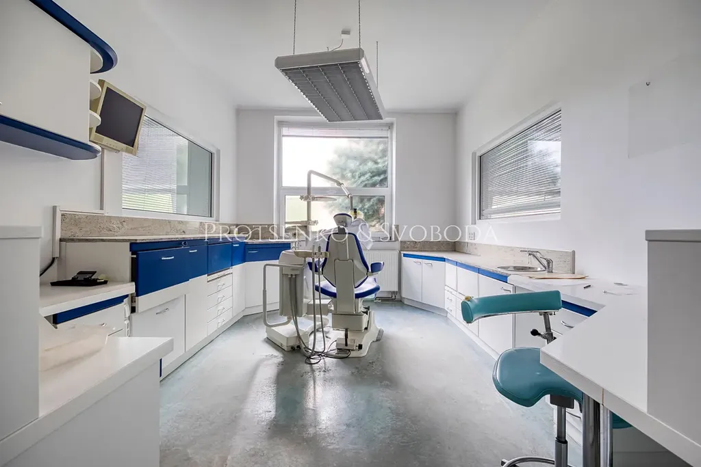 • Přízemí (cca 130 m²) – aktuálně vybaveno jako privátní zubní klinika (čekárna, 3 ordinace, laboratoř, sklady)