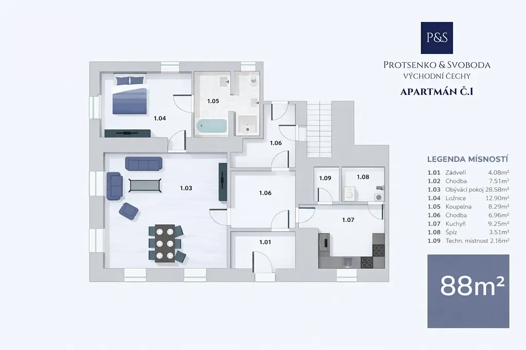 • Apartmán 1 (1. NP, 2+1, 91,27 m²) – prostorný byt se sklepem