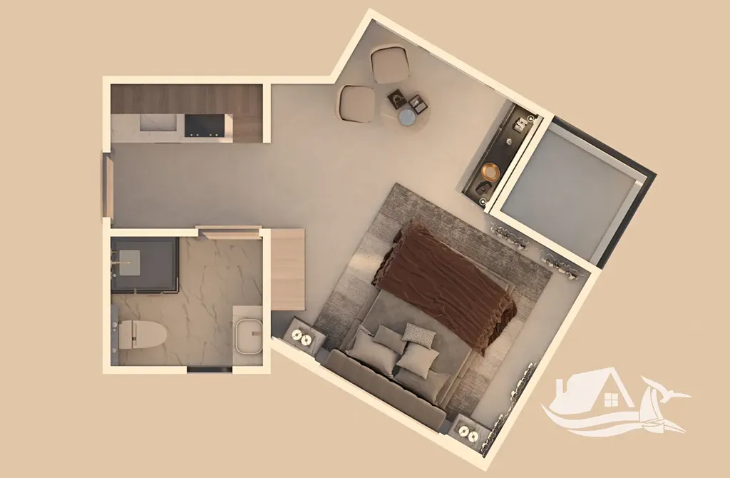 Tento světlý apartmán typu studio o celkové ploše 37 - m² se nachází ve třetím podlaží moderního rezidenčního projektu HAYAT. Otevřené uspořádání prostoru působí vzdušně a harmonicky. Balkon s panoramatickým výhledem na moře vytváří místo, kde se snadno stanou ranní snídaně i večerní posezení malým každodenním rituálem. Interiér je navržen tak, aby byl příjemný pro krátké pobyty i delší život u moře.