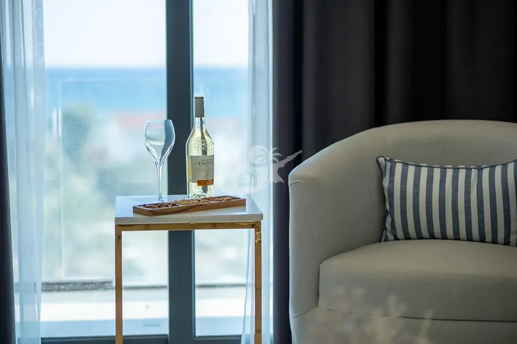 Moderní apartmán 3+kk s balkonem a krásným výhledem na moře a bazén. Nachází se jen pár kroků od pláže, nabízí soukromou pláž, venkovní bazén, fitness, sky bar a barbecue zónu.