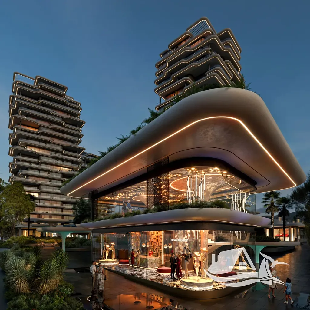 Součástí je také veřejné náměstí s fontánami, kavárnami, restauracemi, luxusními obchody a službami.