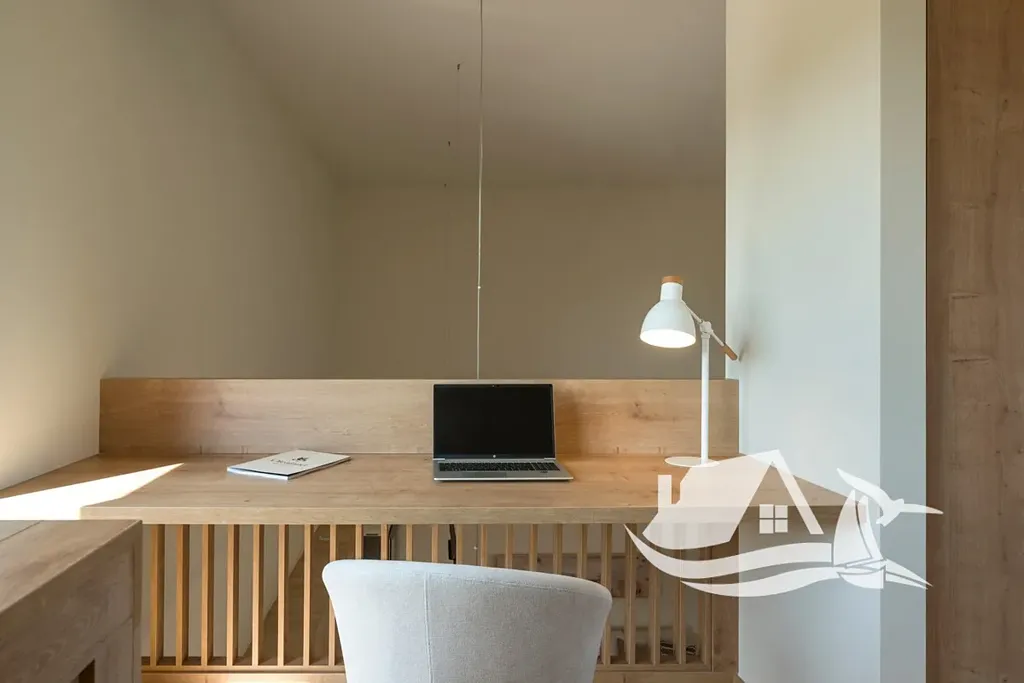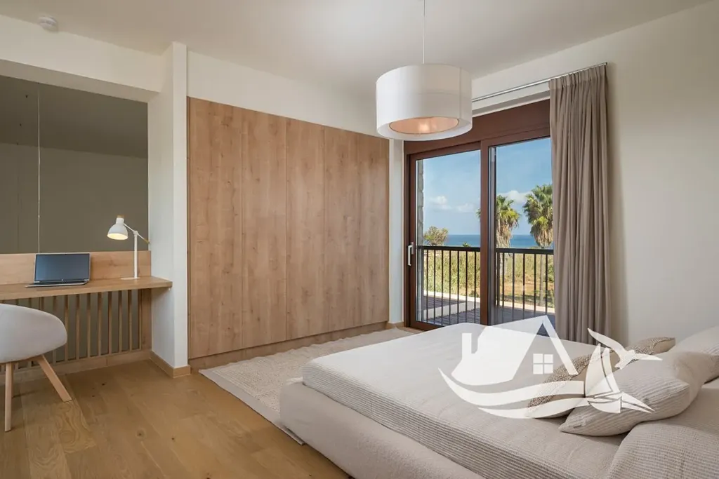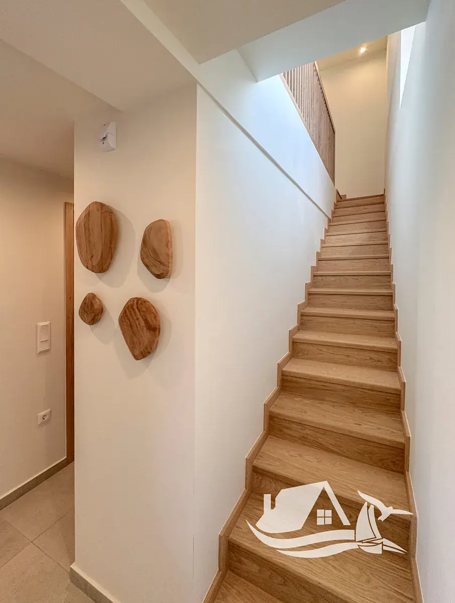 Do horního patra vede dřevěné schodiště, kde se nachází druhá dvoulůžková ložnice s vlastní koupelnou (ensuite), pracovním koutem a vestavěnými skříněmi. Okna na obou stranách zajišťují dostatek denního světla a krásné výhledy na moře i okolní krajinu.