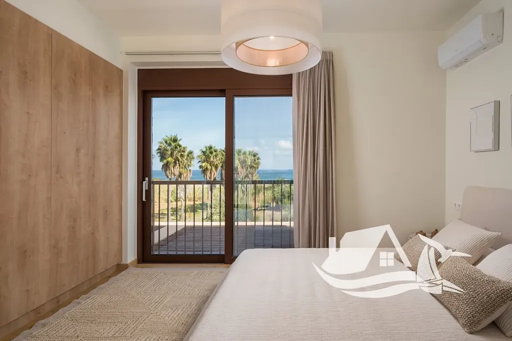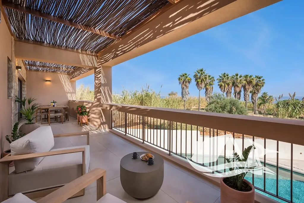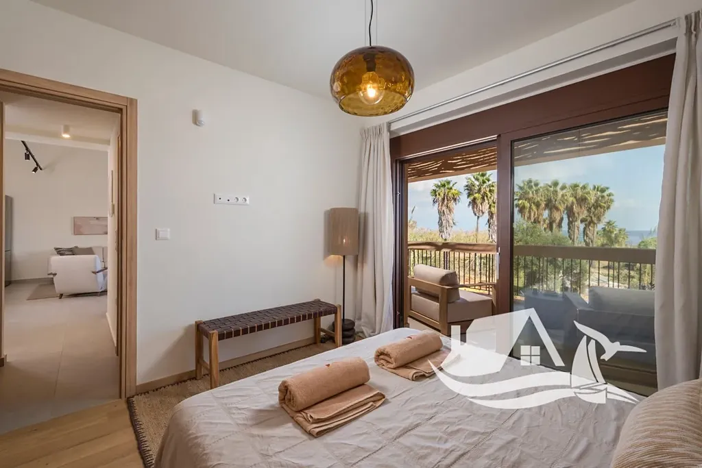 Apartmán se rozkládá ve dvou podlažích (1. a 2. patro) a nabízí otevřené výhledy na moře. Spodní úroveň tvoří světlý obývací prostor s kuchyní, který plynule navazuje na prostornou krytou verandu s dřevěnou pergolou – ideální místo pro stolování, relaxaci i posezení s výhledem na pláž. Dále se zde nachází koupelna a dvoulůžková ložnice s přímým vstupem na verandu.