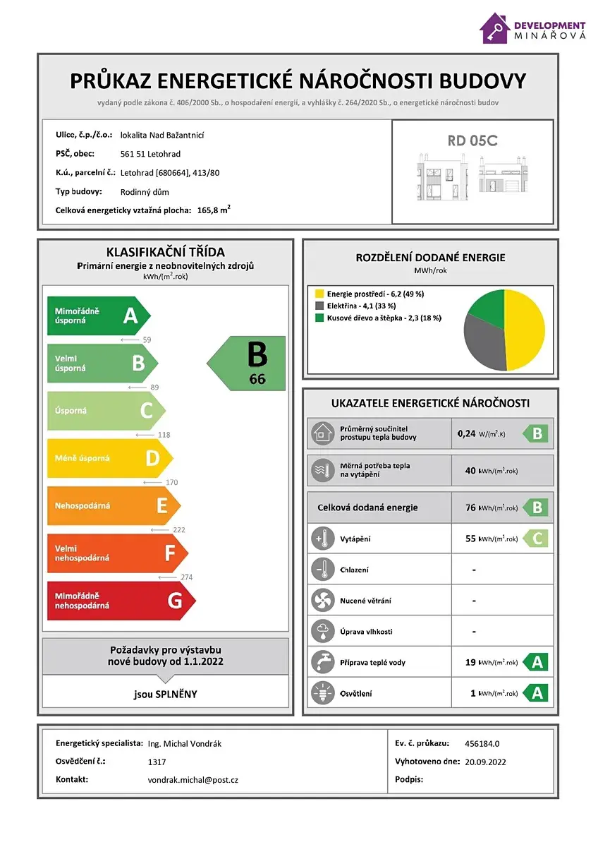 | Ukazatel energetické náročnosti | 66 kWh/m2 za rok |