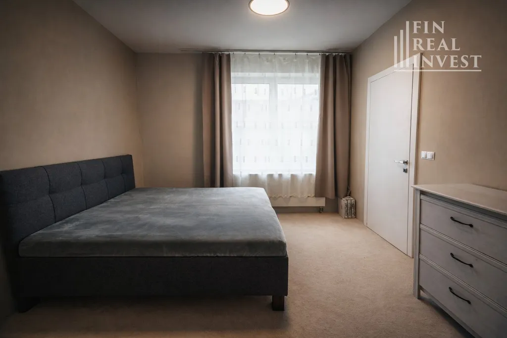 Dominantou bytu je prostorný obývací pokoj s parketovou podlahou, designovými podhledy a nepřímým osvětlením, které vytváří příjemnou atmosféru. Komfort během celého roku zajišťuje klimatizace Samsung Wind Free.