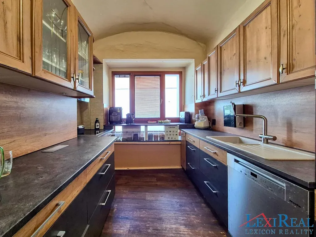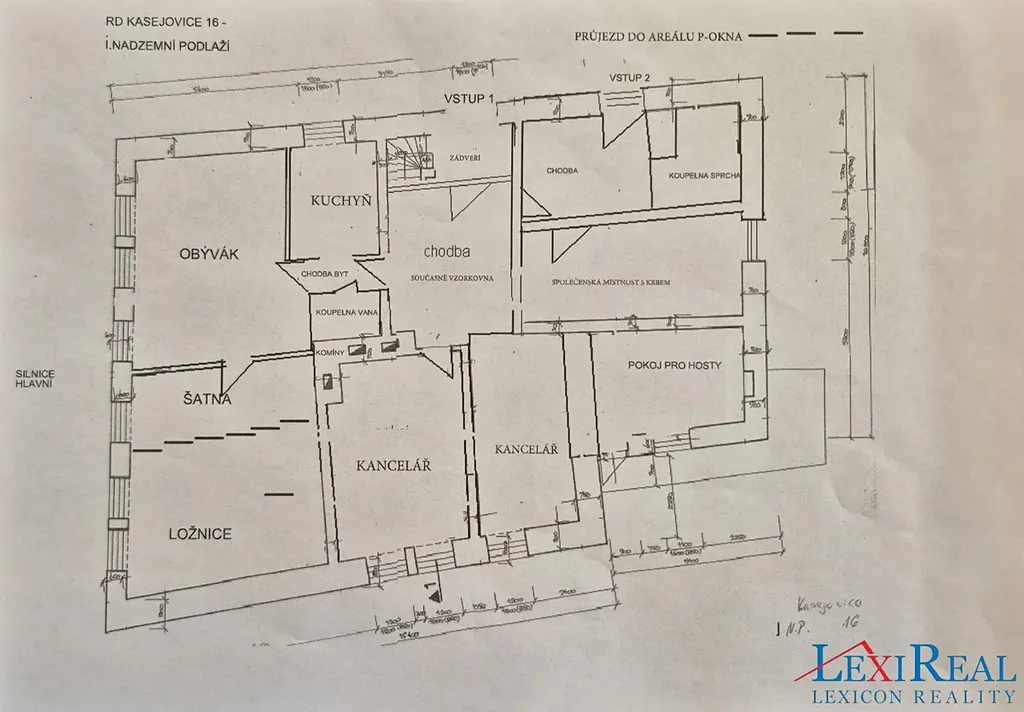 1. podlaží (160 m2 byt 6+1 s 2 koupelnami, propojený s kancelářskými a společenskými prostory (cca 70 m2). Možnost přizpůsobení dle potřeb nového majitele.