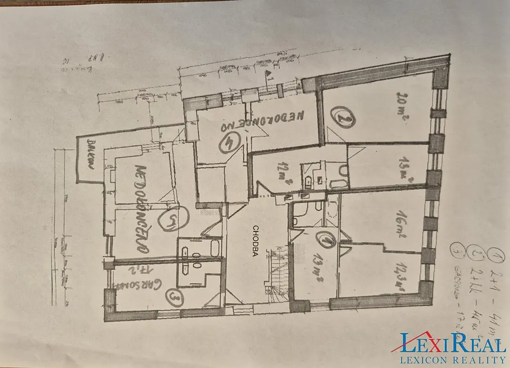 2. podlaží (189 m2) 1x byt 2+1, 1x byt 2+kk, 1x garsonka (připravené k okamžitému nastěhování). Dále dva byty (2+kk a 1+1) nedokončené, materiál k dispozici.