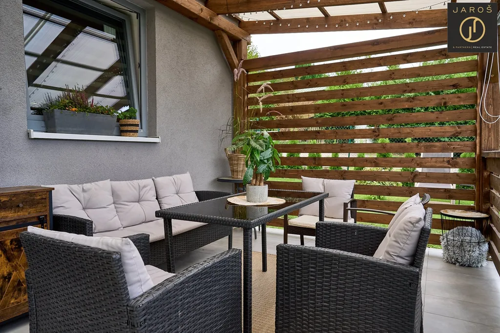 V přízemí se nachází vstupní chodba, koupelna s wc s bidetovou sprškou, umyvadlem a sprchovým koutem, samostatný pokoj, technická místnost a kuchyň s obývacím pokojem s přímým vstupem na zastřešenou terasu. Do patra se dostanete po dubových schodech, kde se nachází hlavní koupelna s vanou. dětský pokoj, ložnice a šatna.
