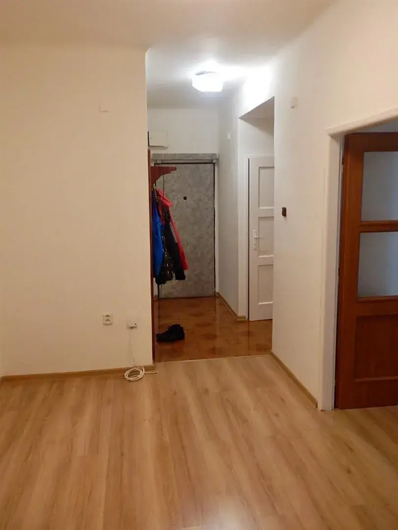 Vstupem do bytu se ocitnete v chodbičce propojené s halou o ploše 10,5 m2, z které se hned po levé straně od vstupu dostanete do kuchyně o ploše 3,14 x 2,63 m ( 8,3 m2 ) s kuchyňským koutem, plynovým sporákem, digestoří, mikrovlnkou, varnou konvicí, dřezem, novou lednicí s mrazákem a novou myčkou nádobí. Z kuchyně je ještě vstup do menší komory. Před kuchyní je umístěna koupelna o ploše 1,8 x 1,6 m ( 2,9 m2 ) s vanou, umývadlem se zrcadlem a pračkou. Hned vedle koupelny se nachází samostatná toaleta. Z předsíně je po levé straně vstup do jednoho z pokojů a zároveň do malé chodbičky, která je oddělena od haly dveřmi. Z chodbičky je následně po levé straně vstup do pokoje, který je předmětem této nabídky. Pokoj o ploše 10,4 m2 ( 2,2 x 4,8 m ) se nabízí bez vybavení, s možností odkoupení skříně, na podlaze je položen koberec. Hned naproti je umístěn třetí z pokojů. V chodbičce, z které je vstup do obou pokojů, se nachází prostorná skříň, na podlaze je plovoucí laminátová podlaha.