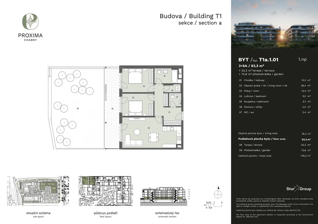 Tento byt 3+kk o velikosti 83,3 m² se nachází v 1. podlaží terasového bytového domu nové etapy Proxima – moderního rezidenčního areálu navazujícího na oblíbené Nové Chabry. Díky velkým oknům, nadstandardnímu prosvětlení a promyšlenému urbanistickému řešení nabízí tento byt prostředí, které si okamžitě zamilujete. V rámci bytu se můžete těšit i na vlastní soukromou zahradu o 72,6 m² doplněnou o terasu o velikosti 22,3 m².