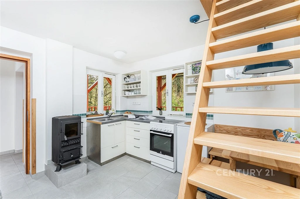 A protože se vám odsud velmi pravděpodobně nebude chtít odjet, je chata připravena i na variantu trvalého bydlení. Je napojena na veřejný vodovod s celoročním provozem, odpadní vody jsou řešeny velkokapacitní jímkou. Ohřev teplé vody obstarává elektrický boiler, teplo zase kamna na tuhá paliva.
