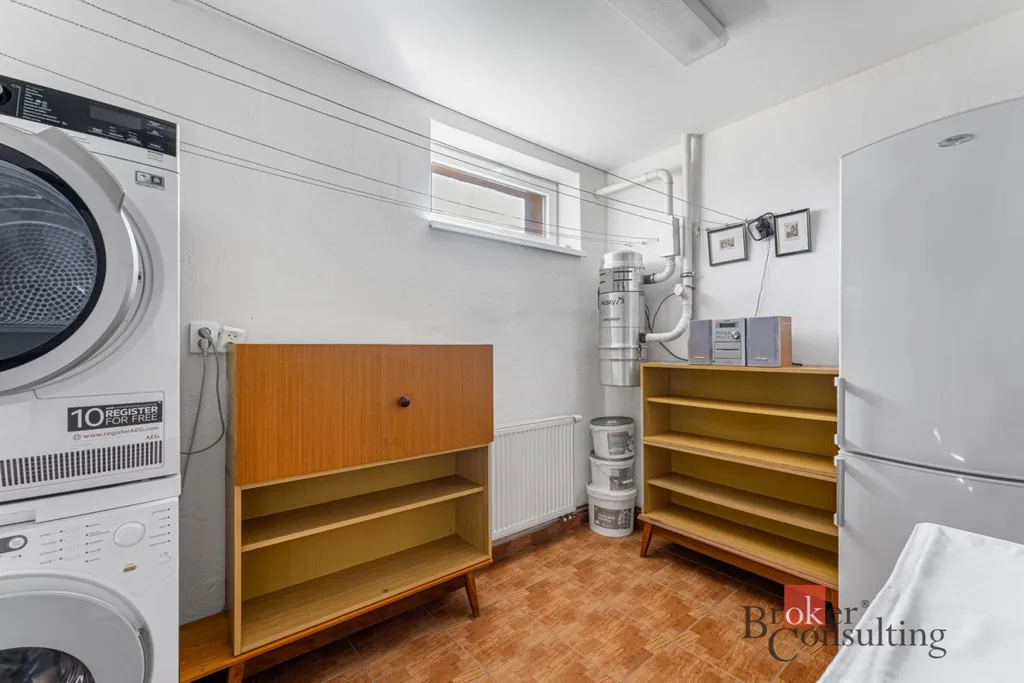 Naproti tomuto pokoji je uzavřená technická místnost s prádelnou, kde je prostor pro pračku a sušičku. Z horní koupelny je sem navíc vyveden shoz na prádlo, takže prádlo jednoduše vhodíte z koupelny a dopadne přímo do prádelny.