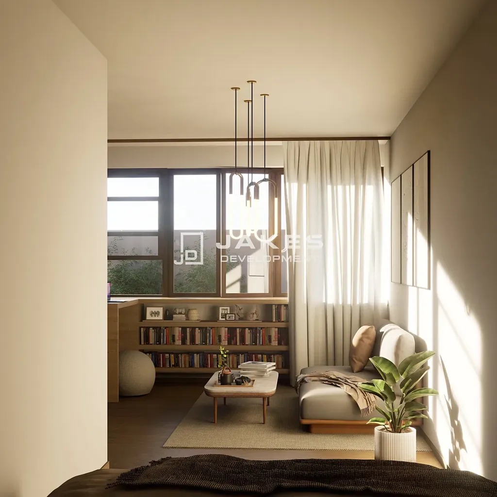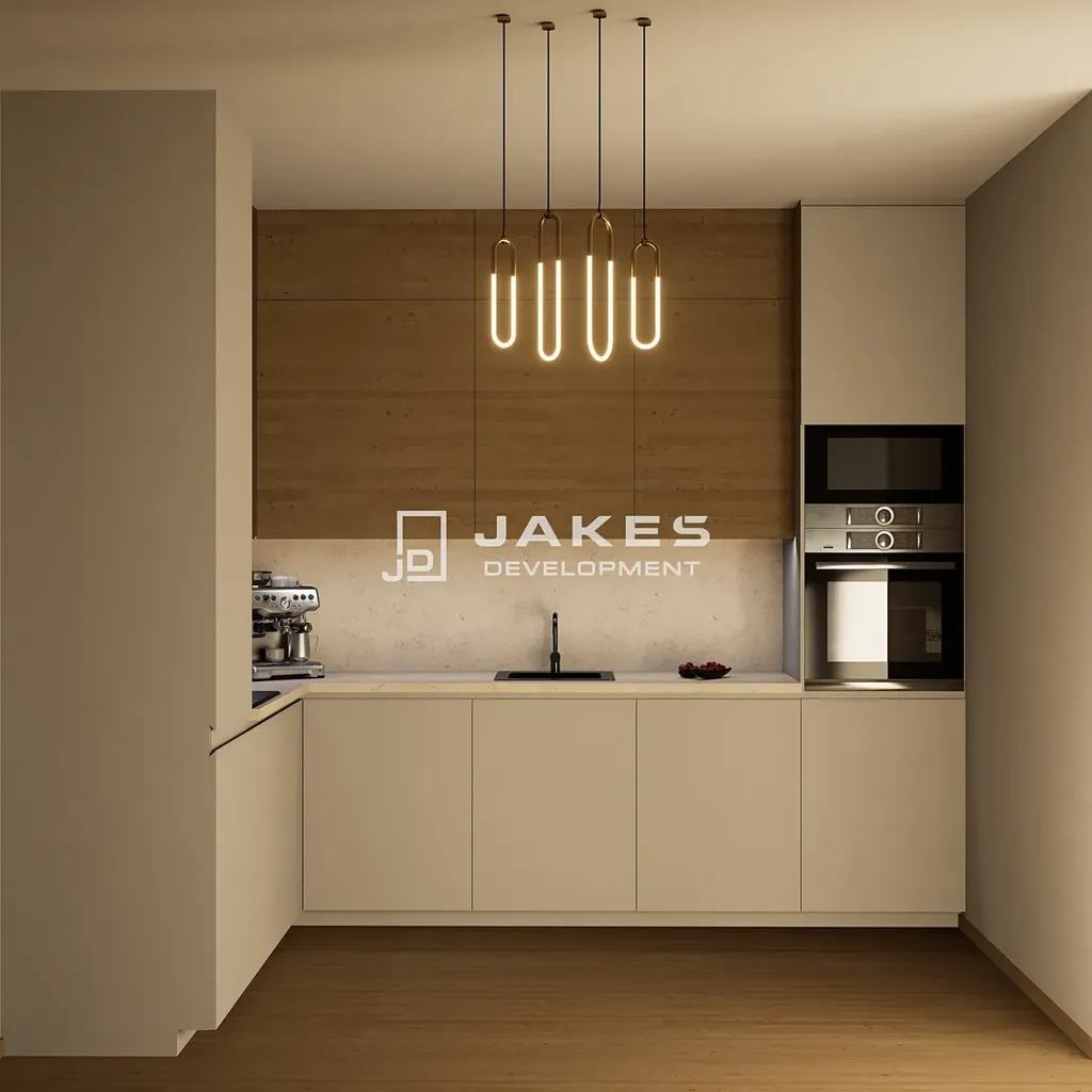 Jednotka bude dokončena ve vysokém standardu. Interiér nabídne dřevěné podlahy, kvalitní sádrové omítky, bezfalcové interiérové dveře, skryté garnýže a podhledy v obývací části, které podtrhnou čistý a moderní charakter prostoru. Příjemnou atmosféru doplní ambientní osvětlení a připravena bude také infrastruktura pro systém chytré domácnosti.