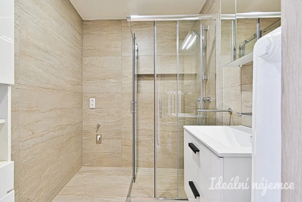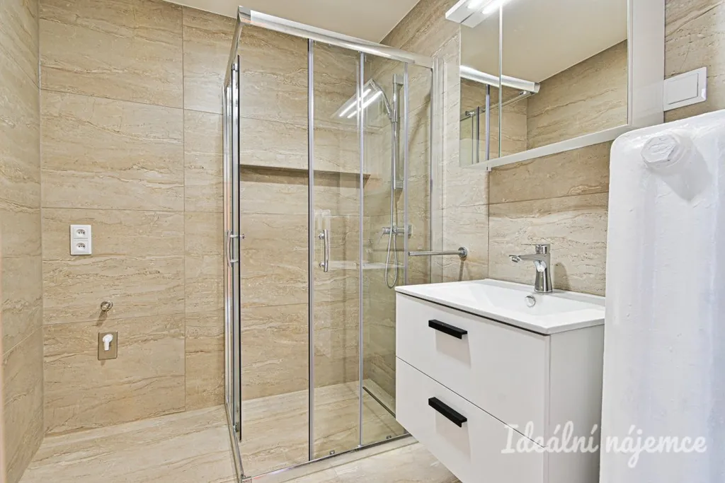 Byt je vybavený dle fotografií. Kuchyňský kout disponuje sporákem, vestavěnou troubou, mikrovlnnou troubou, myčkou, digestoří a lednicí., zbytek místnosti je dovybaven jídelním stolem. Dva zcela oddělené pokoje zůstávají bez vybavení. Koupelna je vybavena sprchovým koutem,, umyvadlem a skříňkami. Toaleta je oddělená. V chodbě nalezneme skříně, které zajišťují dostatek úložného prostoru. K dispozici je taktéž menší šatna.
