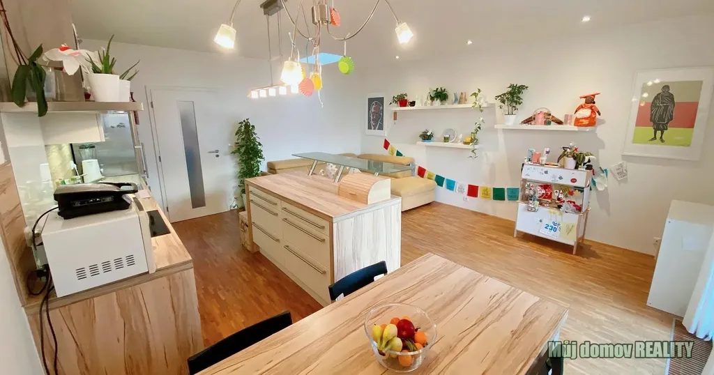 Byt je částečně zařízený a připravený k pohodlnému bydlení pro rodinu, pár nebo spolubydlící. V celém bytě jsou kvalitní dřevěné podlahy, které dodávají interiéru příjemnou atmosféru. Dispozice zahrnuje obývací pokoj s kuchyňským koutem, dvě samostatné ložnice, dvě toalety, koupelnu, chodbu s velkými vestavěnými skříněmi a praktickou komoru. Byt nabízí dostatek úložného prostoru.