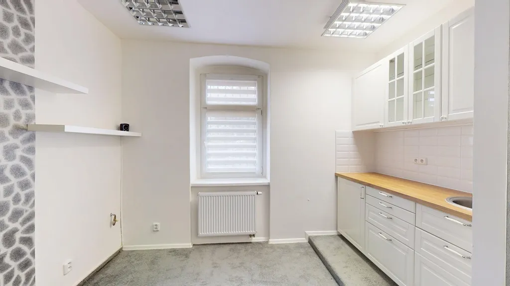 Celková plocha 43 m² je rozdělena na dvě místnosti. Hlavní prostor o výměře 26 m² poslouží jako klientská zóna, menší místnost 15,5 m² má novou kuchyňskou linku a funguje jako zázemí nebo druhá pracovní místnost. Prostor má dva samostatné vstupy z chodby. Součástí je samostatná toaleta na chodbě a vlastní plynový kotel. Vše je po rekonstrukci – nastěhovat se lze okamžitě.
