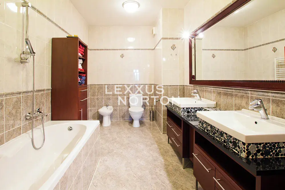 Dispozice bytu nabízí prostorný obývací pokoj, čtyři ložnice, jídelní část s plně vybavenou kuchyní a tři koupelny. K bytu dále náleží terasa o velikosti 45 m2 se zatravněnou plochou. V ceně nájmu je zahrnut sklep a jedno garážové stání, druhé garážové stání je k dispozici po dohodě.