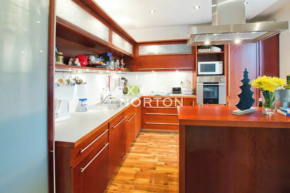 Byt se nabízí jako nezařízený. Součástí vybavení je plně vybavený kuchyňský kout se spotřebiči – sporák, lednice, mrazák, myčka nádobí a mikrovlnná trouba. Podlahy jsou kombinací dřevěné podlahy a dlažby.