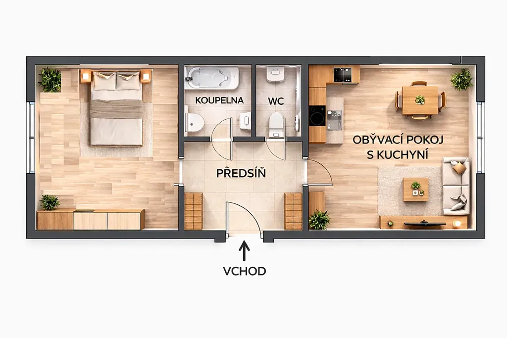 Byt se skládá z předsíně, ložnice , koupelny s rohovou vanou, samostatné toalety a světlého obývacího pokoje s kuchyňským koutem a jídelnou.
