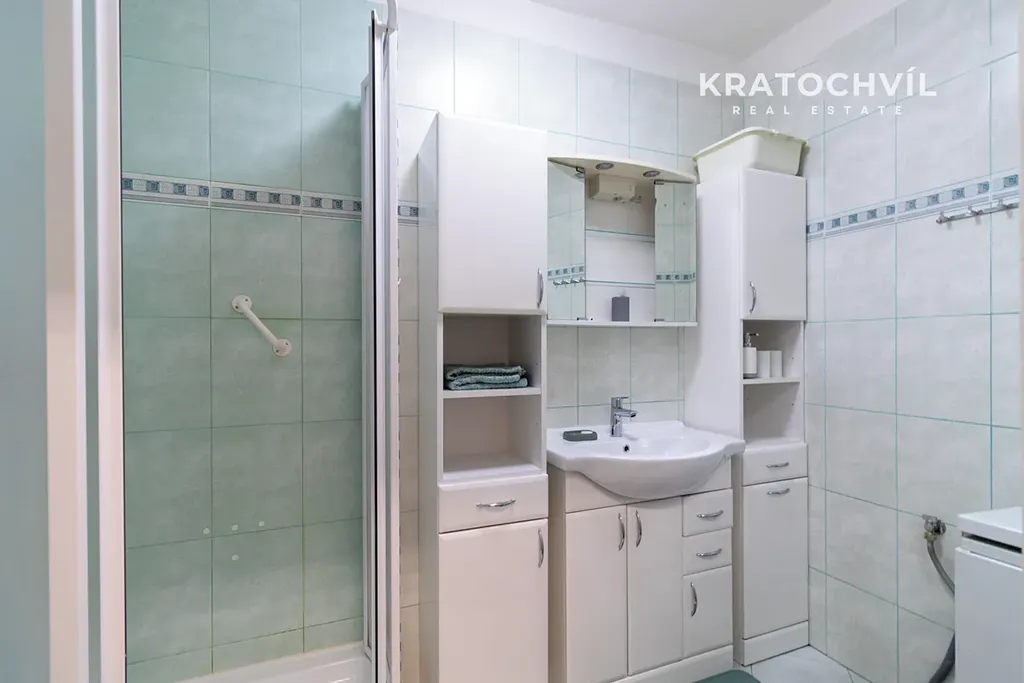 Koupelna disponuje sprchovým koutem, umyvadlem s galerií a pračkou.