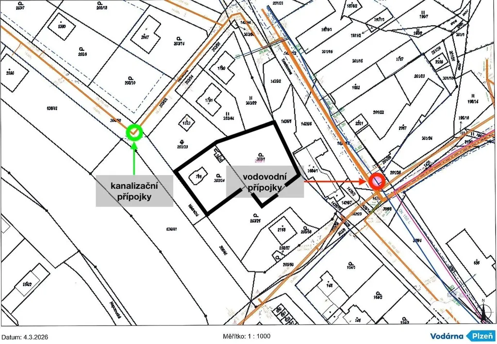 Chalupa, která na pozemku stojí v jeho horní části, je vhodná ke kompletní rekonstrukci nebo k demolici. Je napojená na elektřinu a má vlastní studnu. Kanalizace je svedena do jímky umístěné na pozemku (u garáže). Dle zjištěných informací od Plzeňské vodárny je možné se připojit na veřejný vodovod a kanalizaci.