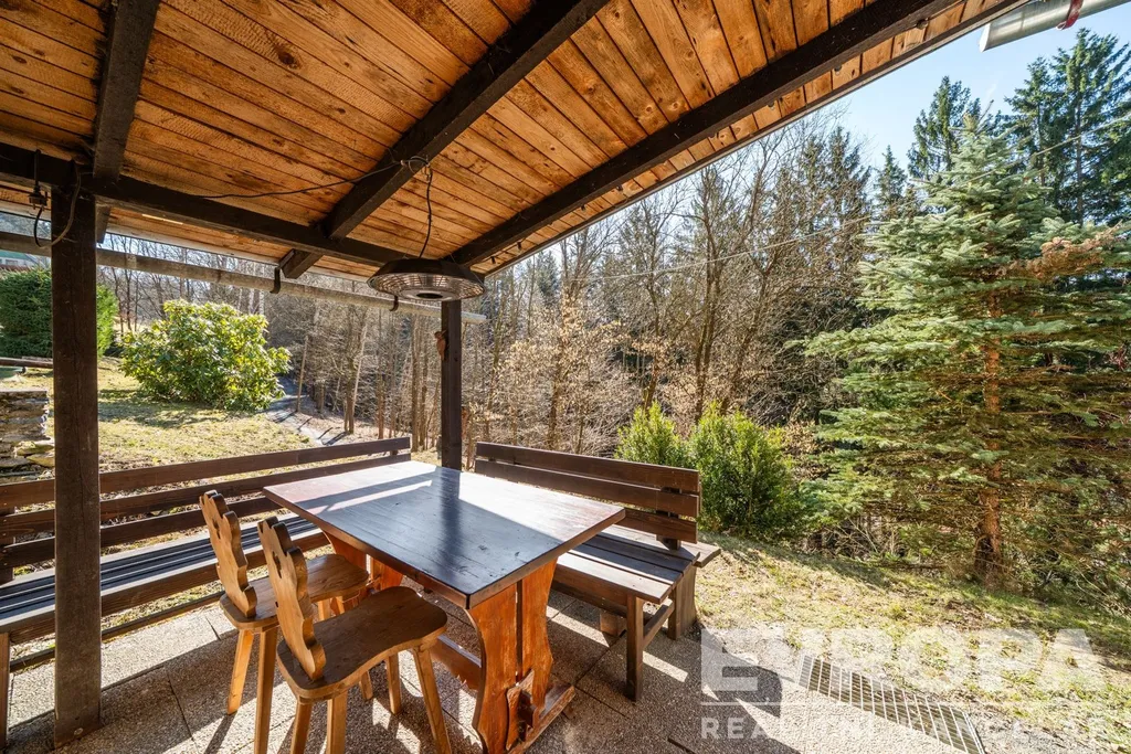 Součástí domu je také zastřešená terasa o velikosti 10 m², ideální pro posezení s výhledem do okolní přírody. Na zahradě se nachází také dřevník pro uskladnění paliva. Nemovitost se prodává včetně vnitřního i venkovního vybavení.