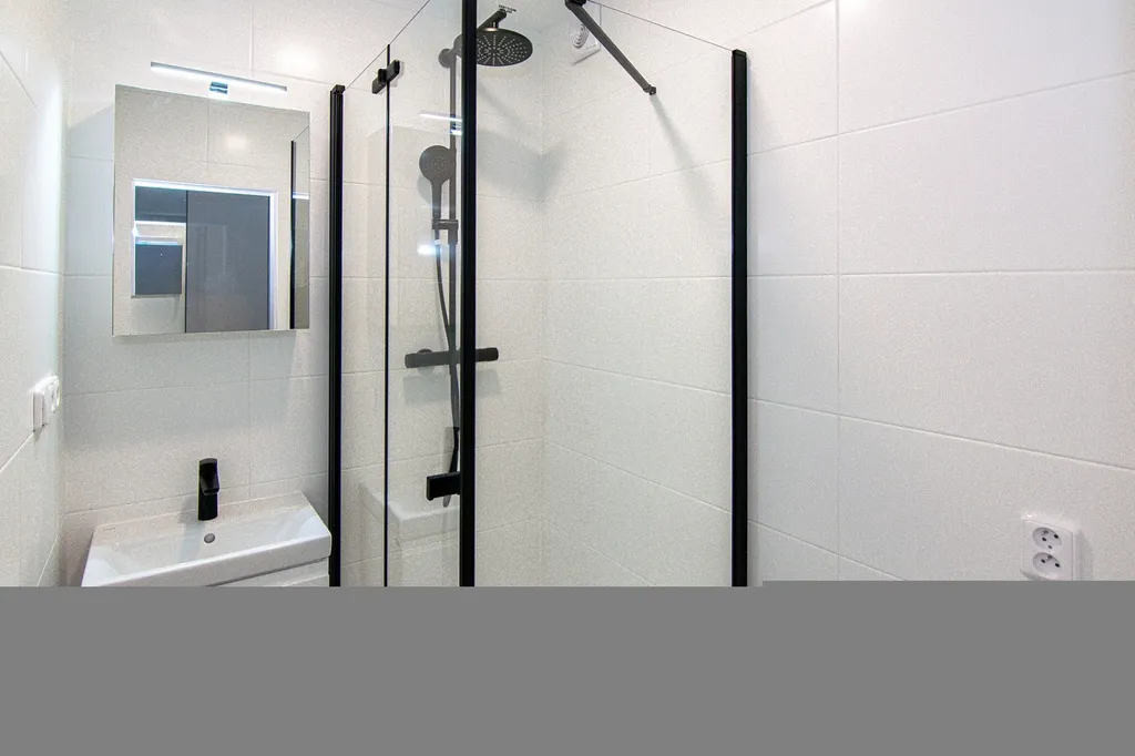 Koupelna disponuje proskleným sprchovým koutem, umyvadlem se skříňkou s úložným prostorem a zrcadlem s galerkou. Je zde prostor pro pračku. Toaleta je samostatná.