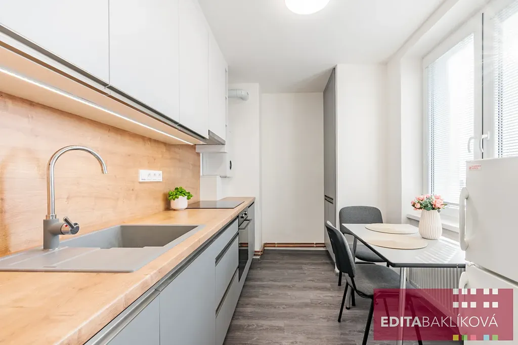 Součástí bytu je plně vybavená kuchyňská linka s dostatkem úložného prostoru, včetně myčky nádobí a volně stojící lednice. Pračka je umístěna v koupelně.