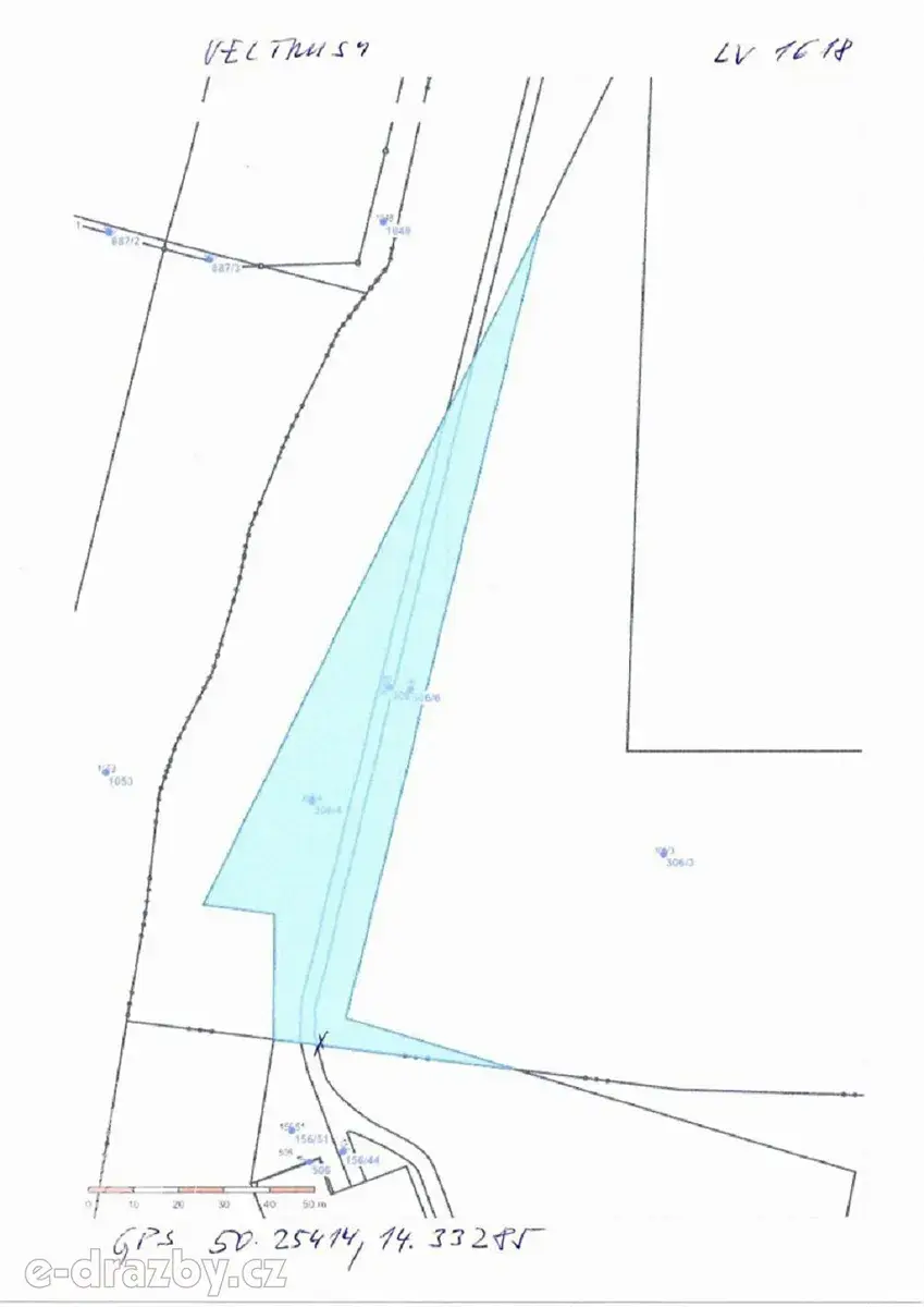 Na pozemku p.č. 306/5 se nachází zpevněná komunikace jiného vlastníka, která není předmětem dražby. Předmětem dražby jsou pouze pozemky. Pozemky byly na místě identifikovány podle mapy z nahlížení do katastru nemovitostí, pro přesné určení v terénu je nutné vyměření pozemků oprávněným geodetem.