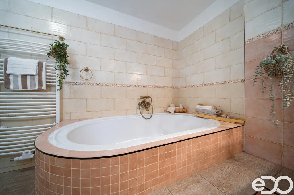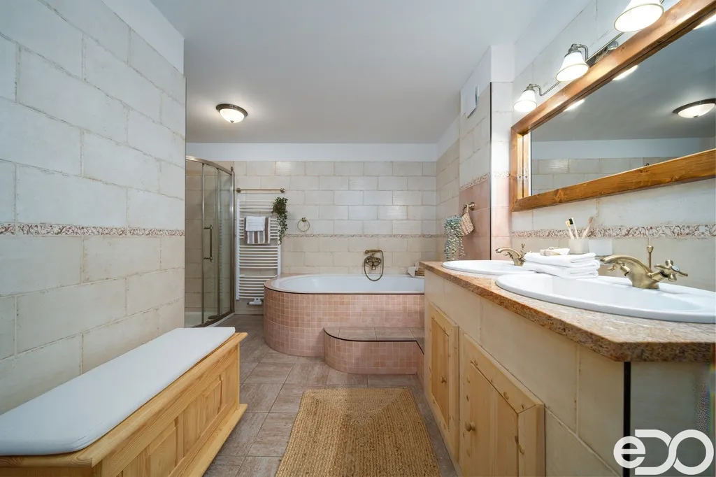 Koupelna je vybavena rohovou vanou i sprchovým koutem, dvěma umývadly a toaletou. Povrchy tvoří keramická dlažba a obklady.