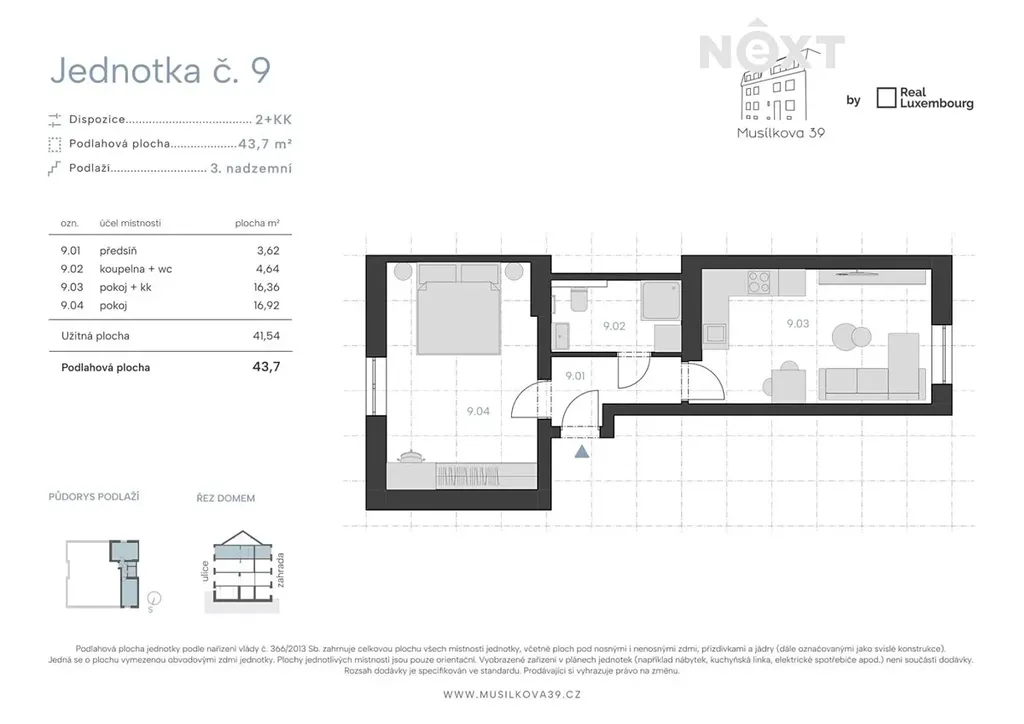 - Chytře řešený prostor: Byt 2+kk se nachází ve 3. nadzemním podlaží (2. patře) a nabízí podlahovou plochu 43,7 m².