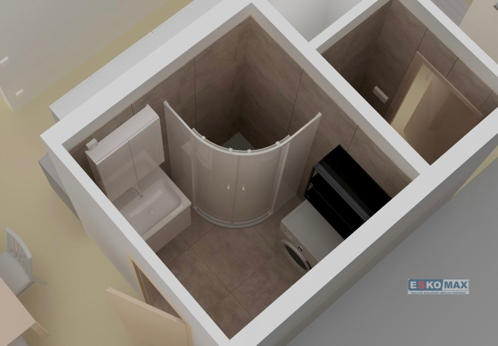 • Koupelna a WC: moderní sprchový kout, nové obklady a sanita, úložné skříňky, pračka se sušičkou.