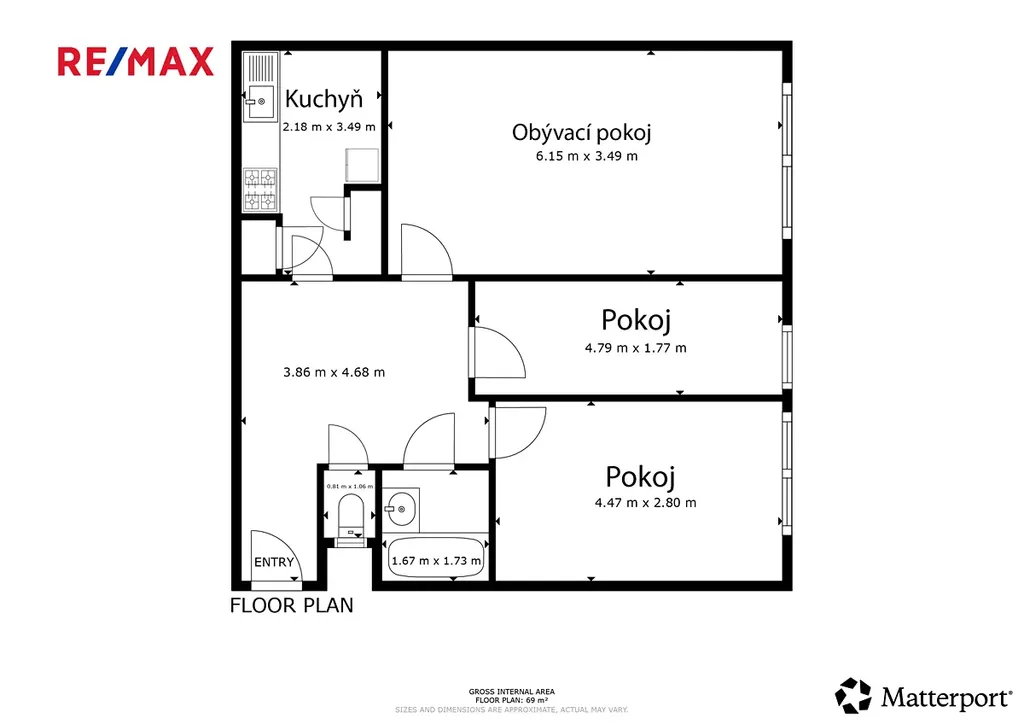 Byt má podlahovou plochu 64,3 m² a náleží k němu sklepní kóje 2,4 m², která se nachází prakticky ve stejném patře, hned vedle bytu.