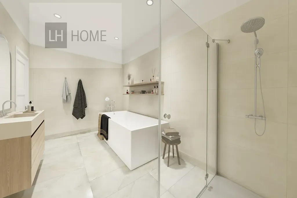 Při předání bude byt ve stavu dokončeného standardu – hotové podlahy, stěny a kompletně obložené koupelny.