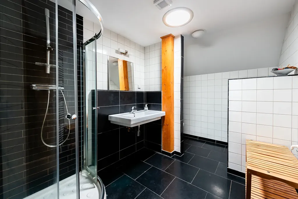 Horní patro domu je rozděleno na dva samostatné apartmány, které lze využívat odděleně nebo společně.