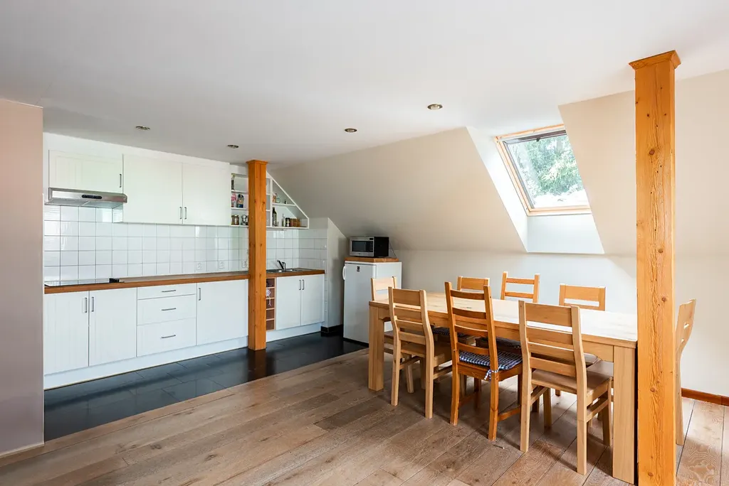 Velkorysý obývací prostor s kuchyňským koutem a jídelnou doplňuje prostorná ložnice a koupelna se sprchovým koutem a bidetem. Po dřevěném schodišti se vstupuje do podkrovní ložnice se střešním oknem.