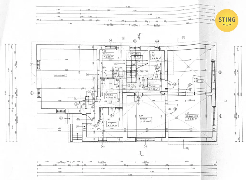 1.NP: zádveří (5,79 m2), chodba (10,56 m2), komora (5,31 m2), kuchyň (17,76 m2), spíž (4,34 m2), obývací pokoj (21,53 m2), pokoj (21,90 m2), koupelna (8,68 m2), WC (0,90 m2), schodiště (7,64 m2).