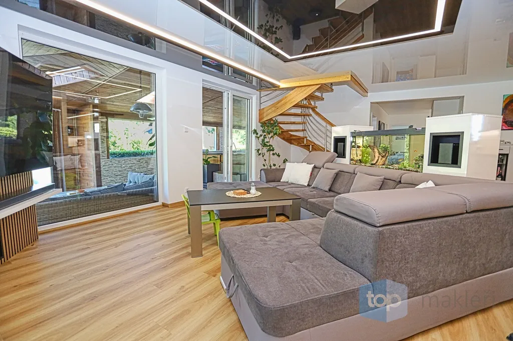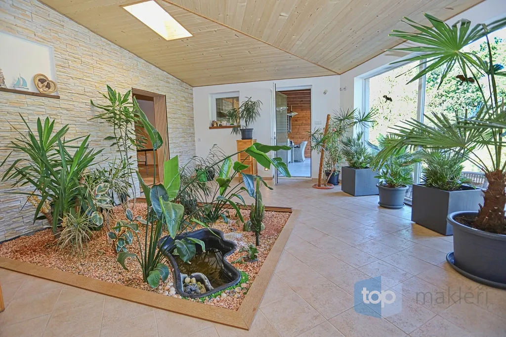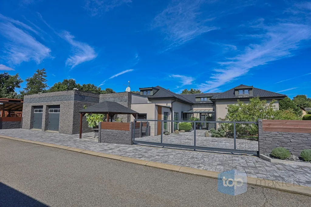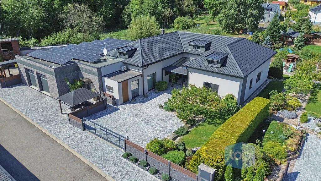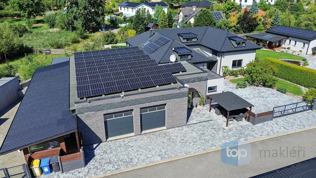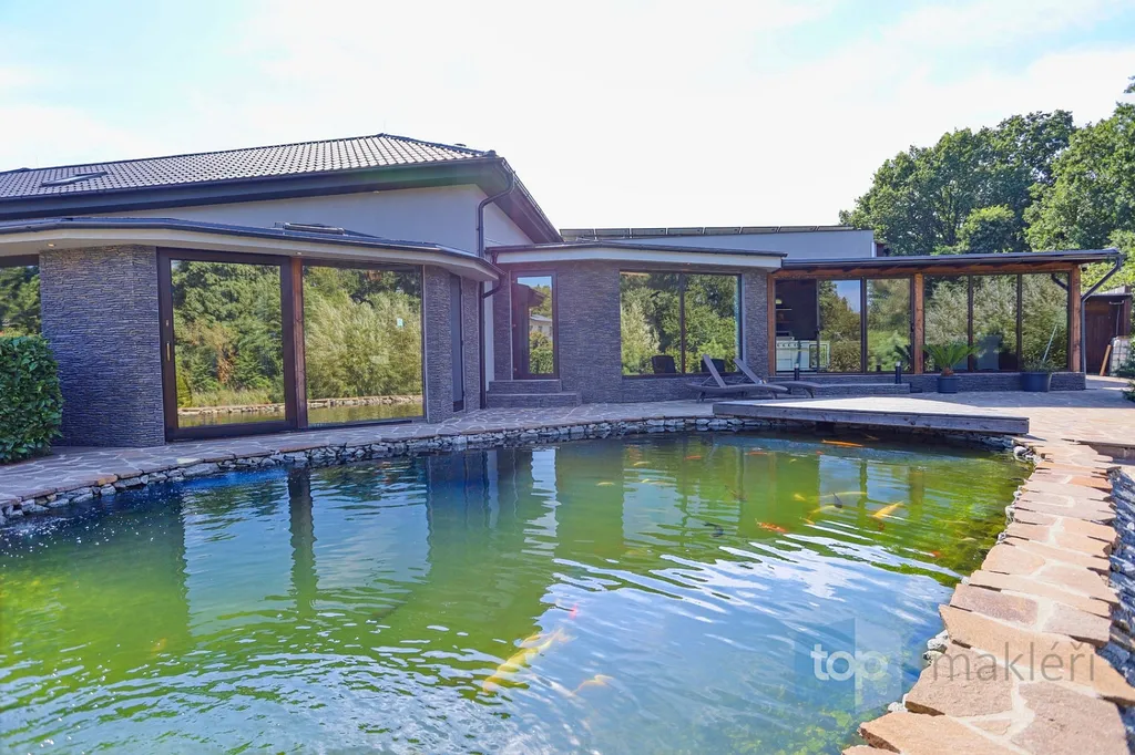 Dnes tu máme něco speciálního. Vždyť kousek od Prahy v nádherné krajině Posázaví se nachází známá obec Pyšely. A v její části Zaječice stojí dům, který nezná kompromisy. Při celkové rozloze 699 m² a pozemcích o rozloze 6672 m² je to nemovitost, kde opravdu nebudete mít málo místa. Již od garáže (vlastně prakticky servisu), kde se může zaparkovat až 5 aut, přes prostorné obytné místnosti, hernu, posilovnu, kancelář, až po zimní zahrady s vnitřním bazénem, či venkovní kuchyní. Na zahradě jsou pak části pro odpočinek, třeba u jednoho ze dvou jezírek s rybami, tak i vedlejší částí, kde jsou třeba i lavičky a ohniště přímo v zeleni a dokonce i potok. Díky použitým technologiím získáte energetickou třídu A podporovanou tepelným čerpadlem a na střechách je fotovoltaika o výkonu 23 KW a z toho je 13 KW s garantovaným odkupem (výnos při provozu domu navíc je cca 80.000,- Kč/ rok). Samozřejmostí je i bateriový úložný systém pro vyrobenou energii. Dům je i částečně klimatizovaný pro váš domácí komfort. V hlavních obytných místnostech jsou designové napínané stropy a v obývacím pokoji je pro zimní pohodu i krb.