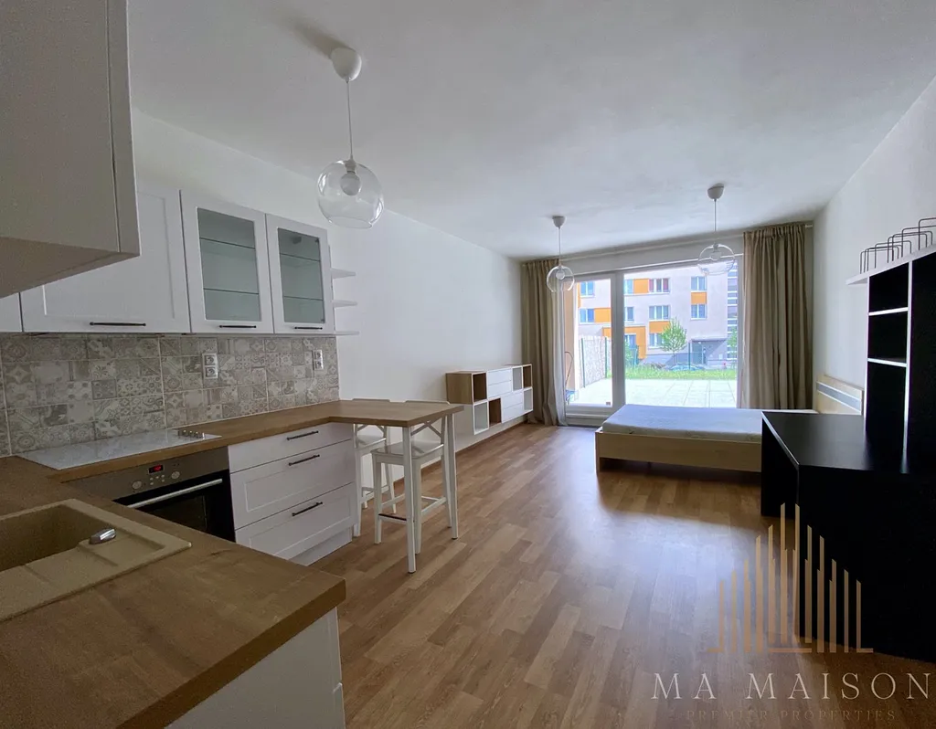 Dispozičně je byt řešen jako obývací pokoj s kuchyňským koutem a přímým vstupem na předzahrádku, která nabízí příjemné soukromí a prostor k relaxaci. Kuchyňská linka je téměř plně vybavena – trouba s varnou deskou, lednice s mrazákem a digestoř.