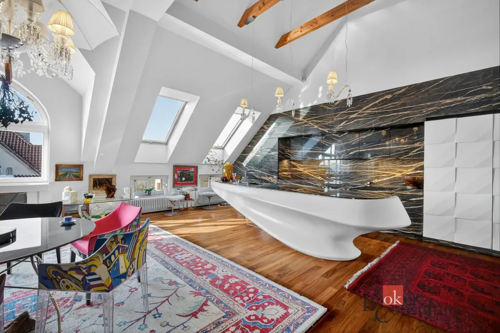 Součástí obývacího prostoru je exkluzivní kuchyňská linka na míru, kompletně provedená v mramoru a vybavená špičkovými spotřebiči značky Gaggenau. Kuchyně byla realizována v hodnotě několika milionů korun a představuje výrazný designový prvek celého interiéru.