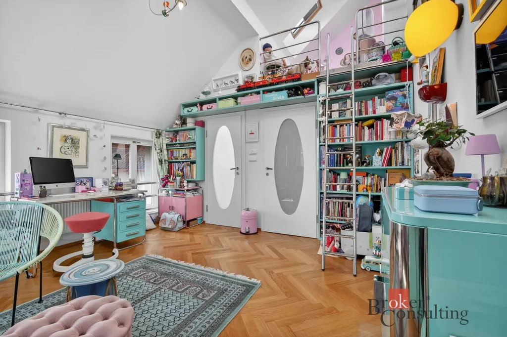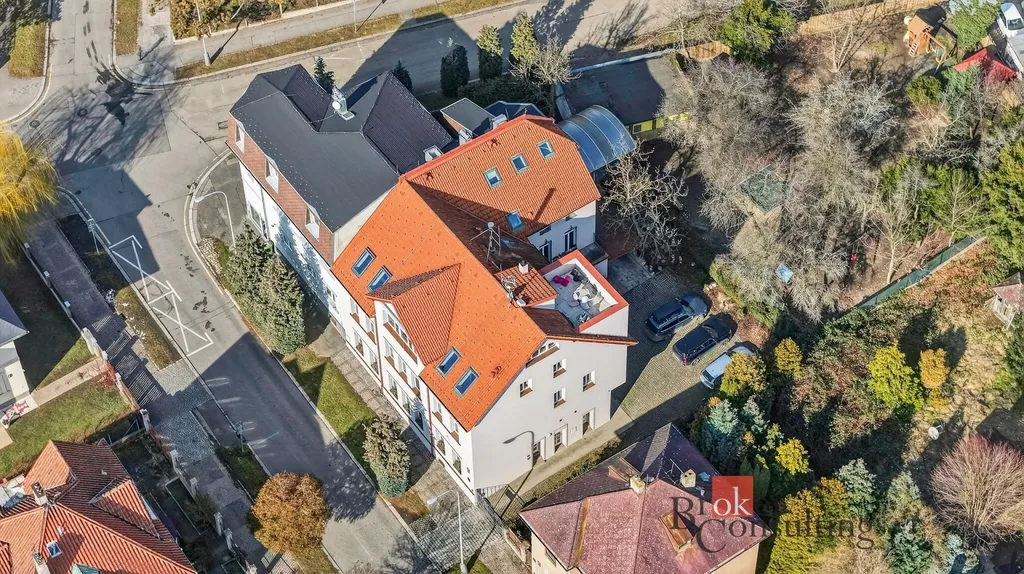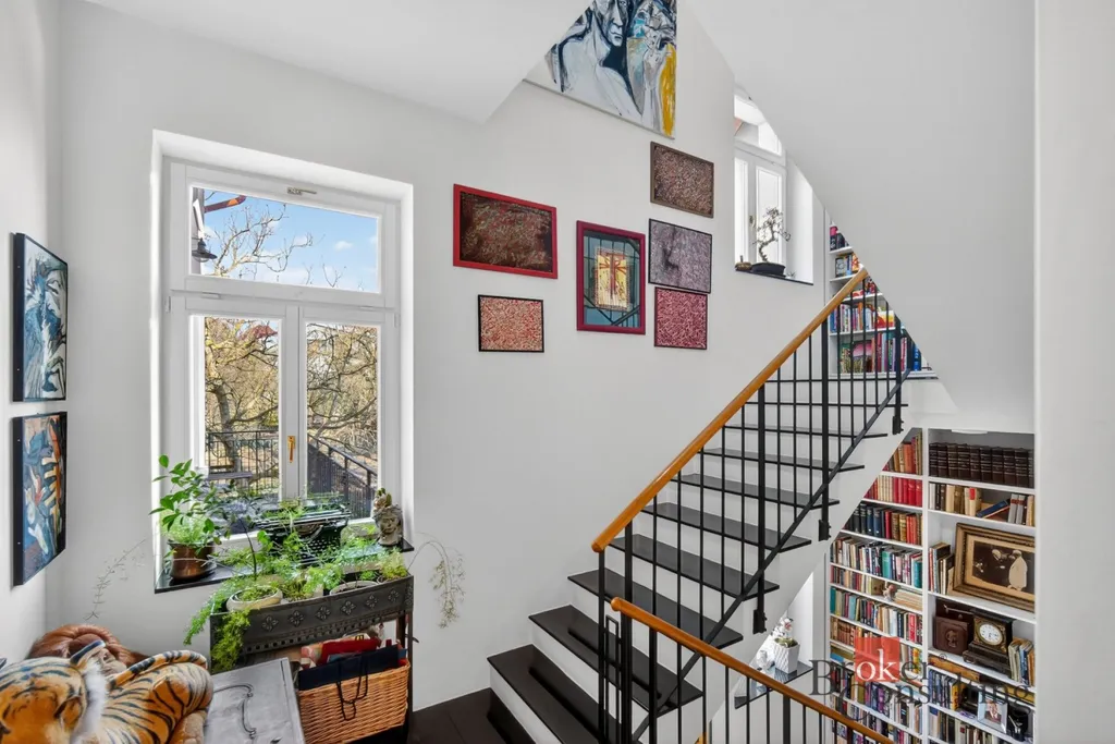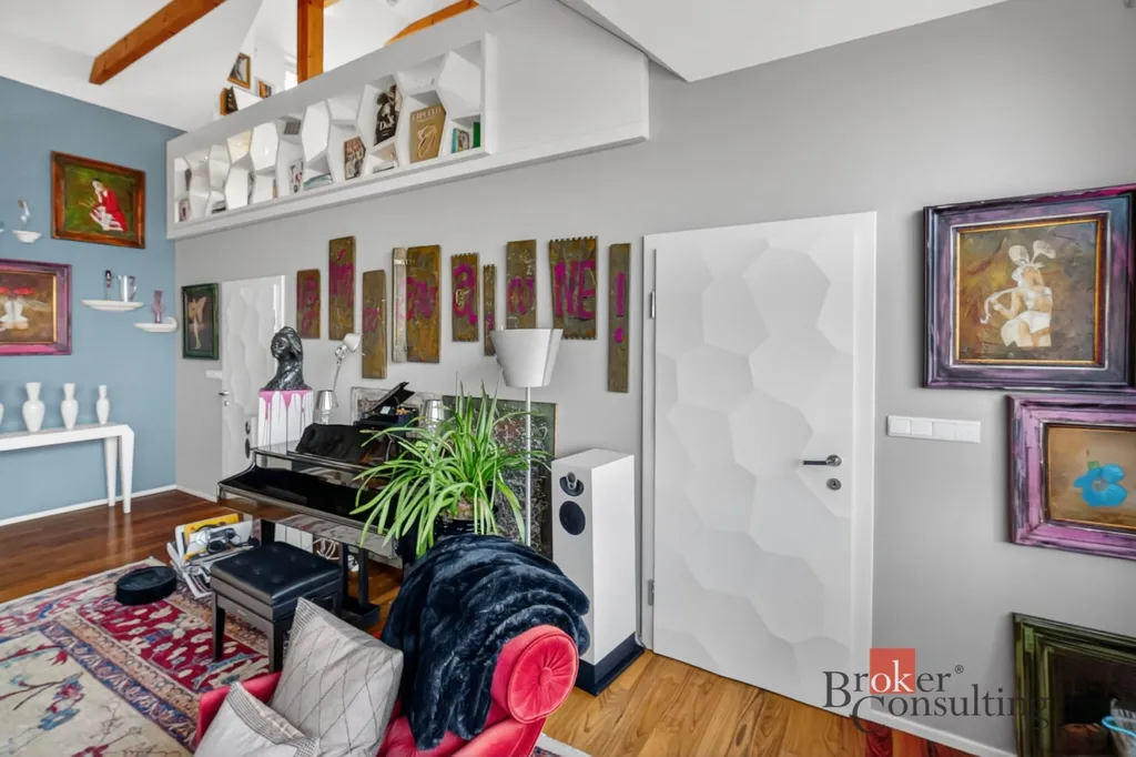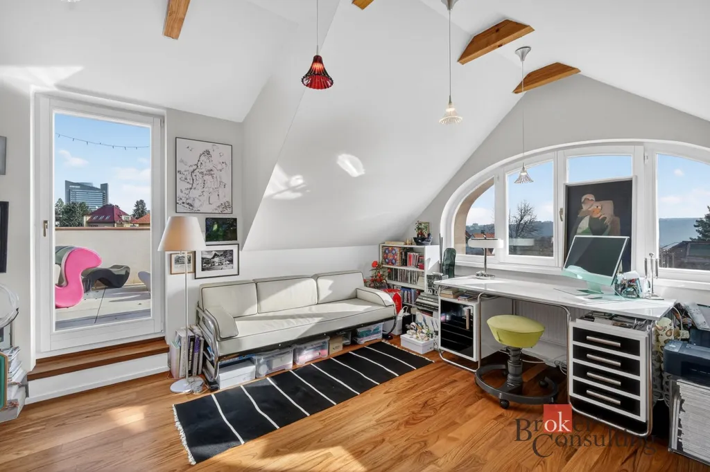 Byt zabírá celé horní patro a podkroví elegantní vily, což přináší nejen dostatek soukromí, ale také atmosféru bydlení, která se blíží rodinnému domu.