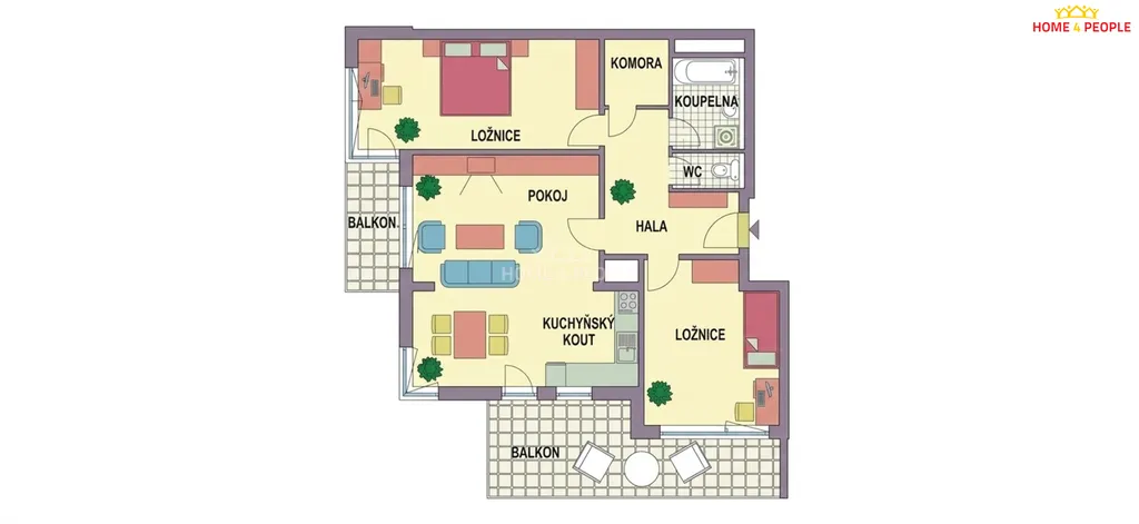 Dispozice bytu tvoří vstupní hala (9 m²), prostorný obývací pokoj s kuchyňským koutem (30,9 m²), dvě ložnice (14,1 m² a 17,8 m²), koupelna s vanou (3,9 m²), samostatné WC (1,4 m²) a komora (2,9 m²) poskytující praktický úložný prostor. Velkou výhodou jsou také dvě lodžie o velikosti 4,7 m² a 15,3 m², které rozšiřují obytný prostor a nabízejí příjemné místo pro odpočinek.